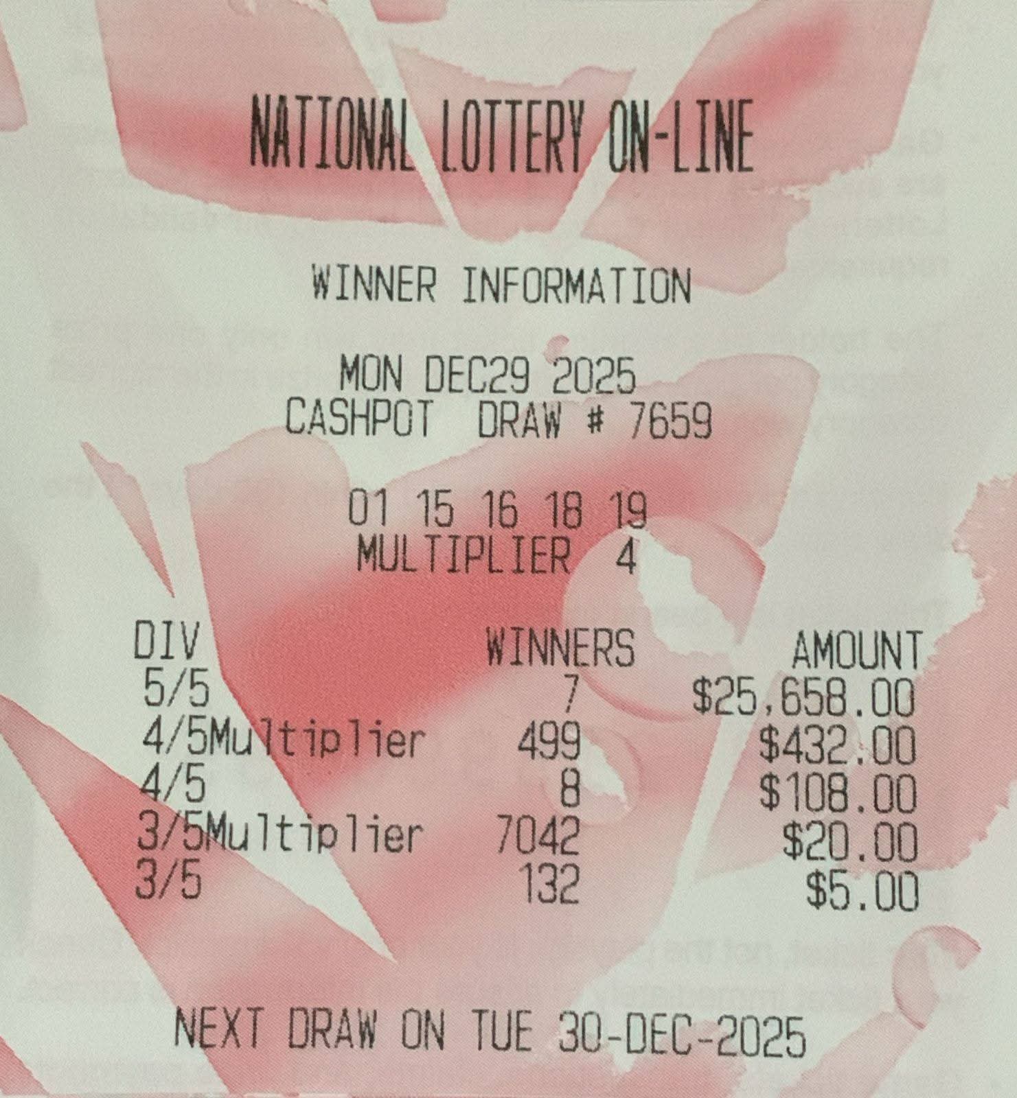 Any results from today….I got 4 numbers, how much will i receive?