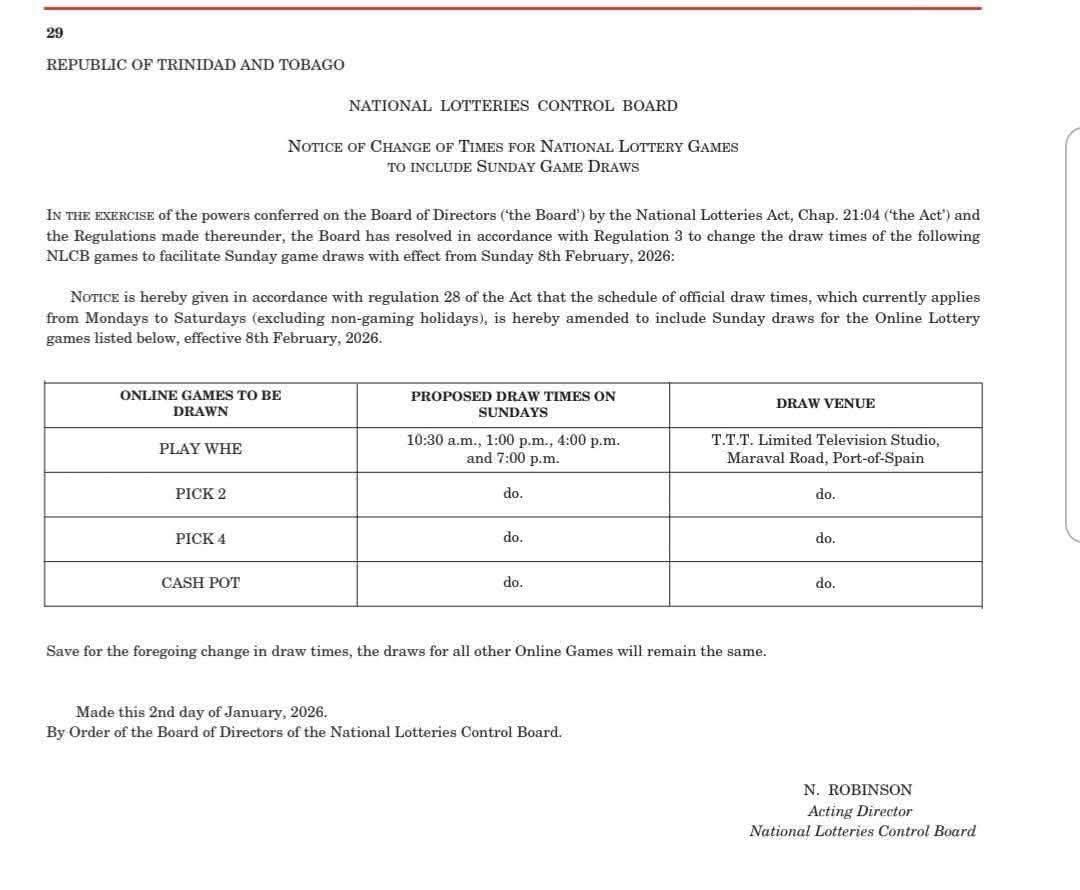 Under the updated order, Sunday draws will be held for Play Whe, Pick 2, Pick 4 and Cash Pot at the TTT television studio in Port of Spain. Play Whe, Pick 2 and Pick 4 will be drawn at 10.30 am, 1 pm, 4 pm and 7 pm, while Cash Pot will have a single Sunday draw at 7 pm.