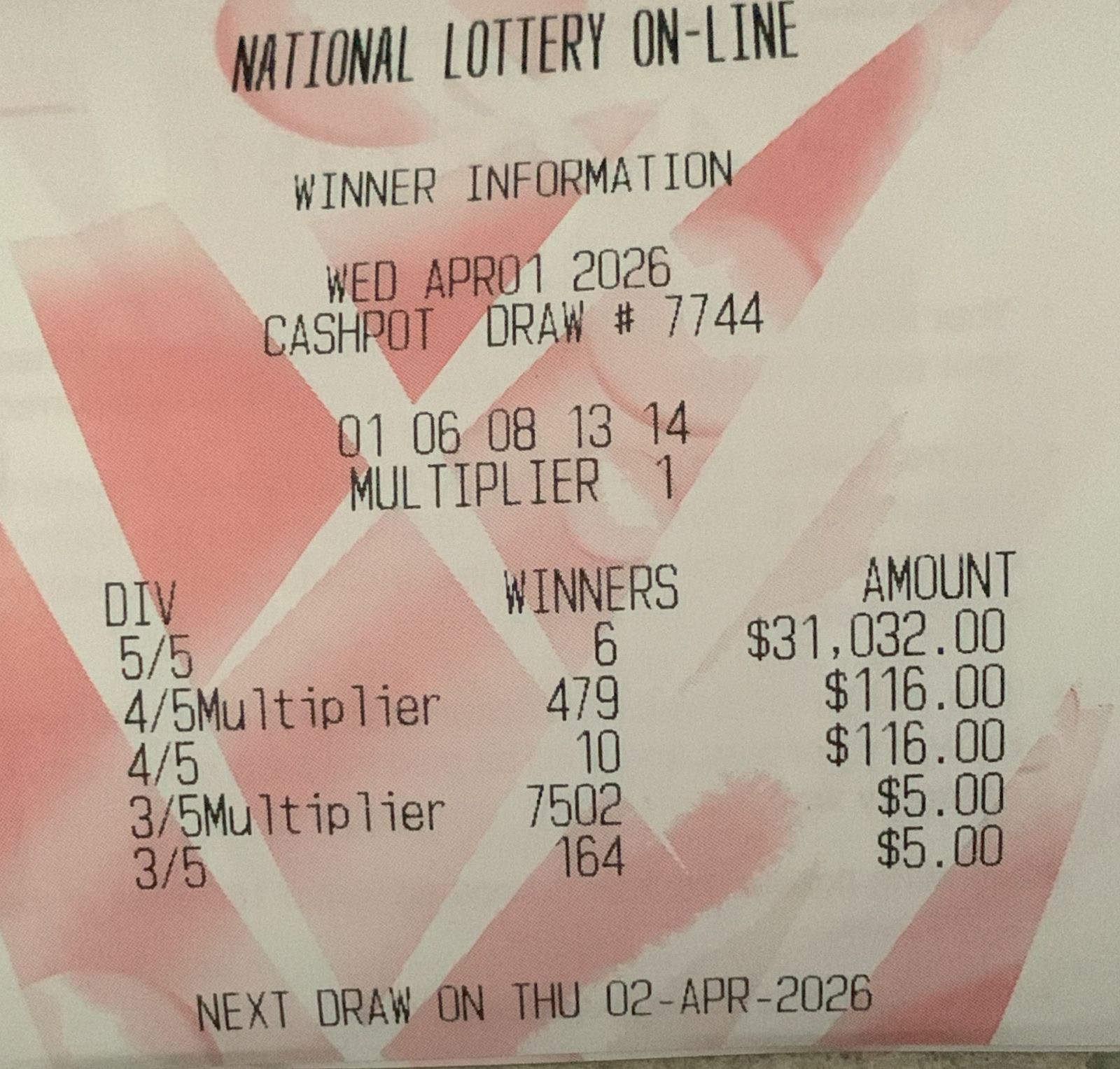 Is there any readout on winners for lastnights cashpot?
