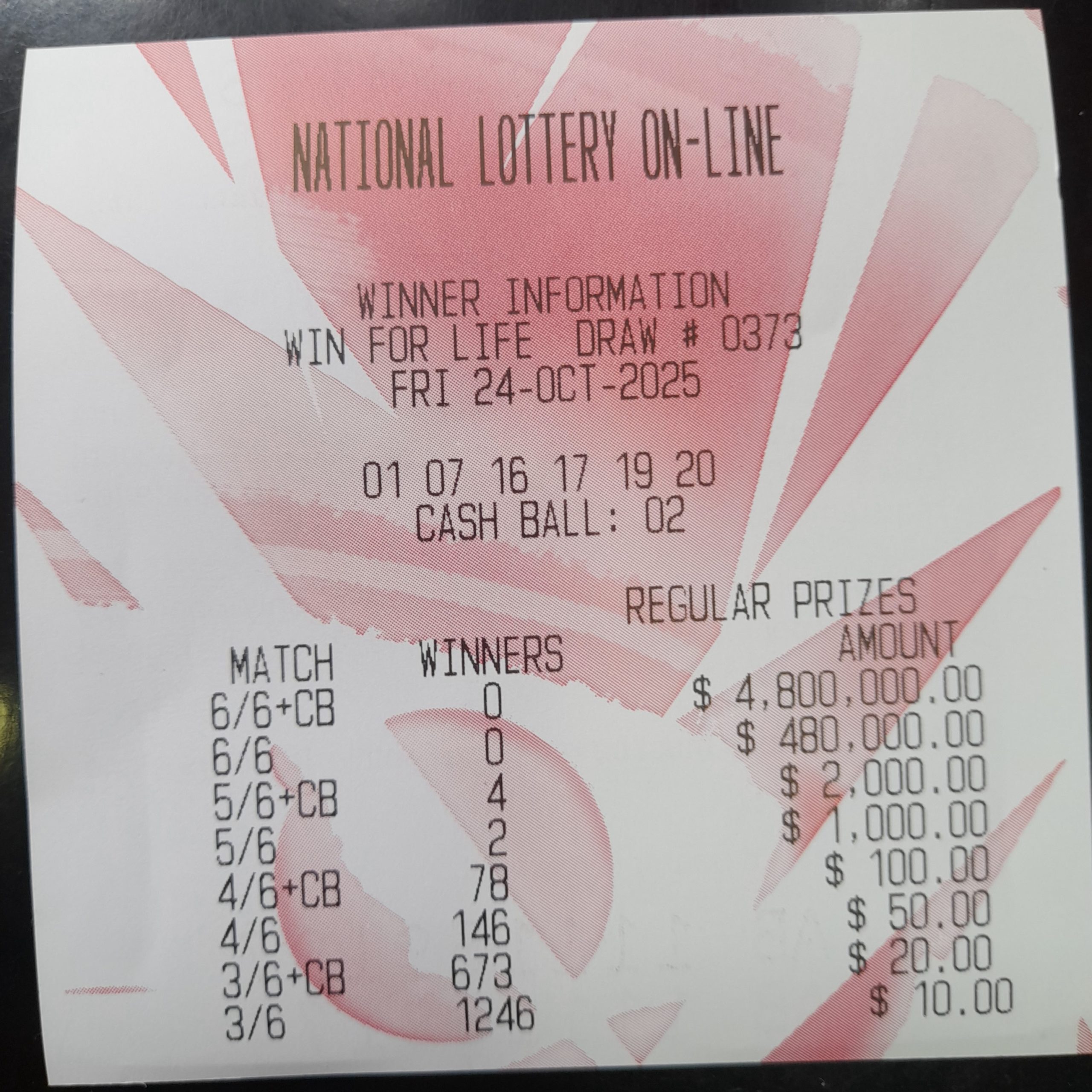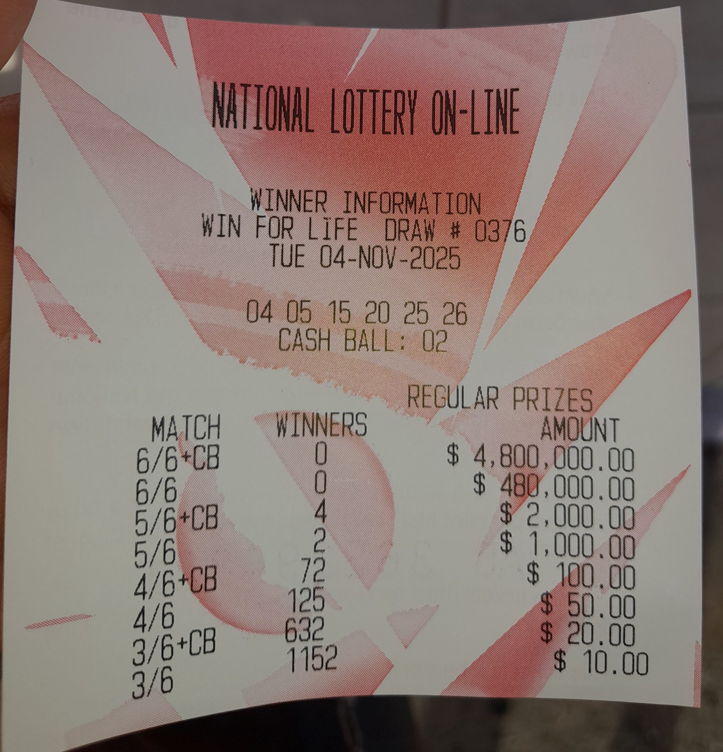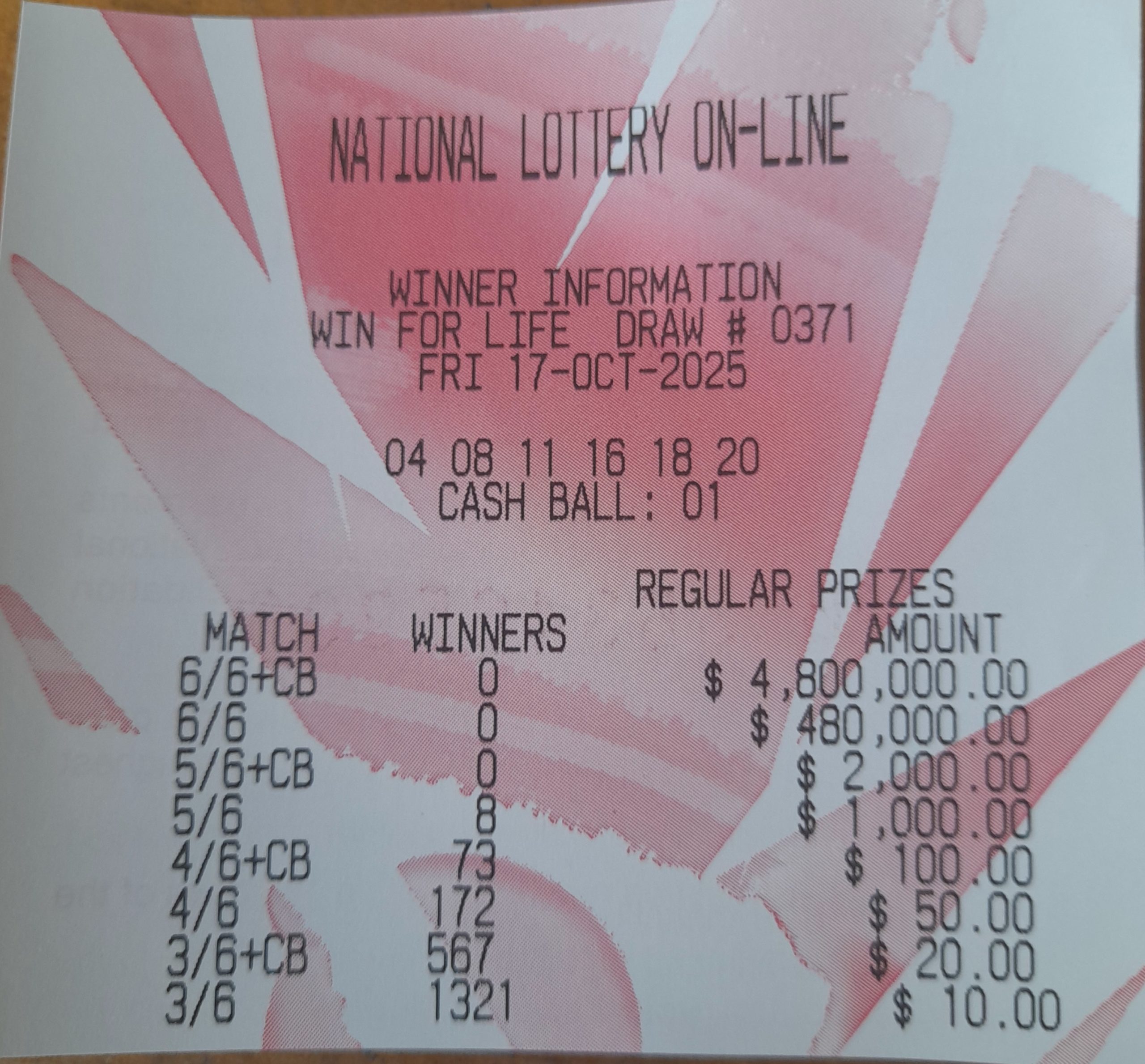 PLEASE NOTE THAT THIS IS NOT THE NLCB's OFFICIAL WEBSITE. However, the Win for Life results are primarily acquired from the NLCB's televised draws to ensure accuracy. Your Win for Life ticket, not the play slip, is your only valid receipt. All winning Win for Life tickets must be validated at an online agent and claimed no later than 180 days from the Win for Life draw date. Good luck.