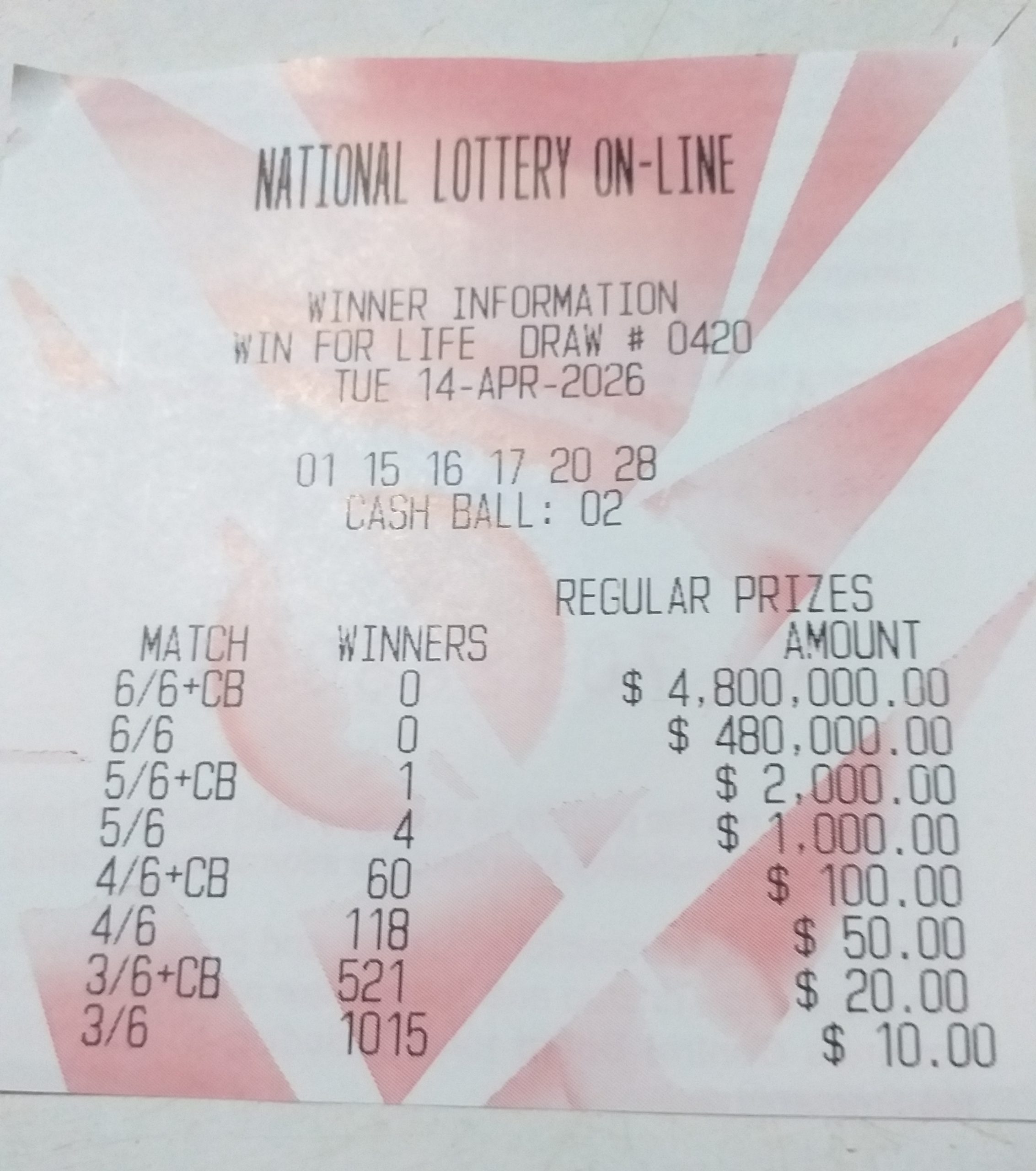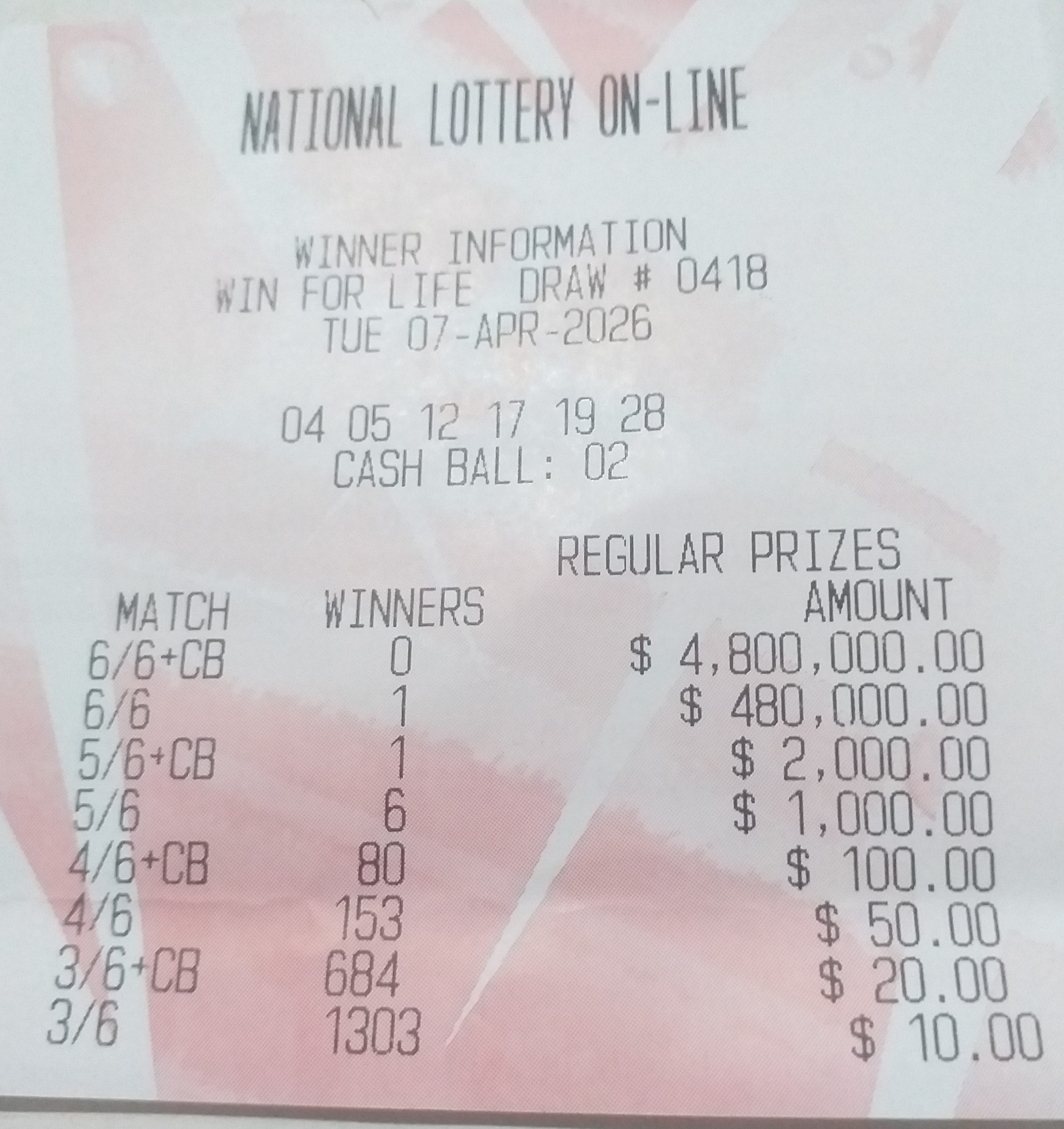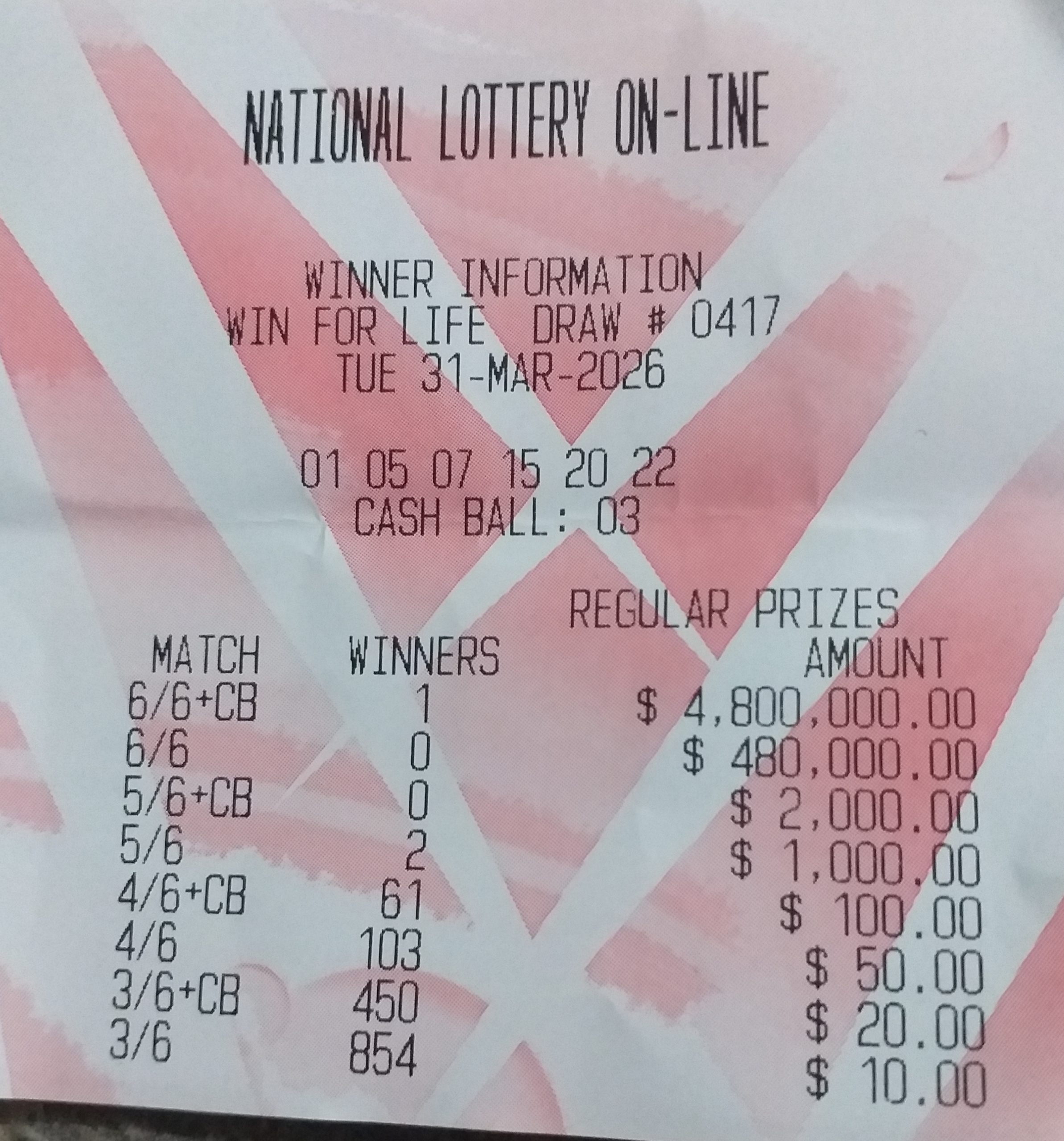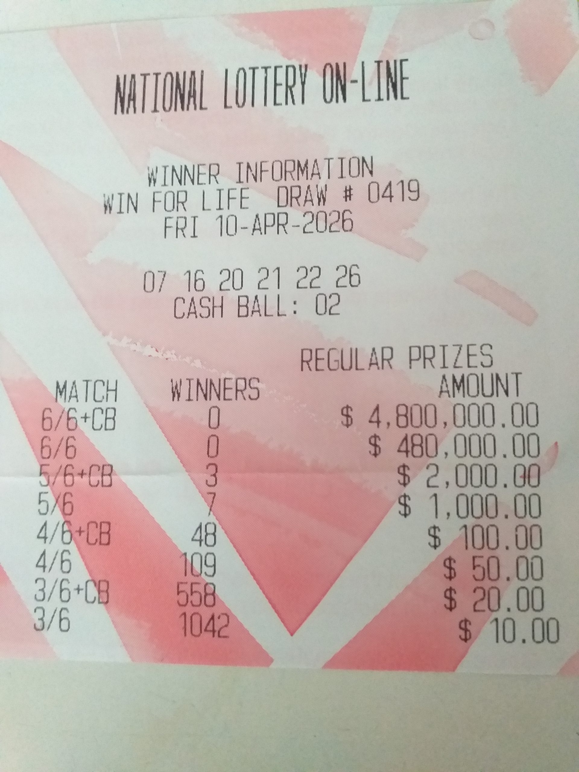 Good people please post the latest winning payout slip for win for life. Thank you!